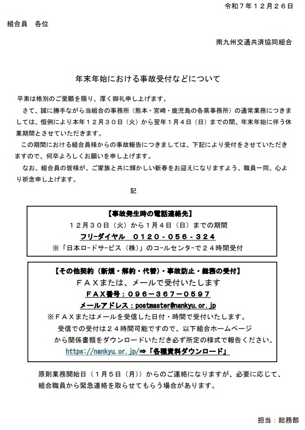 年末年始の営業について(R7.12.30~R8.1.4)
